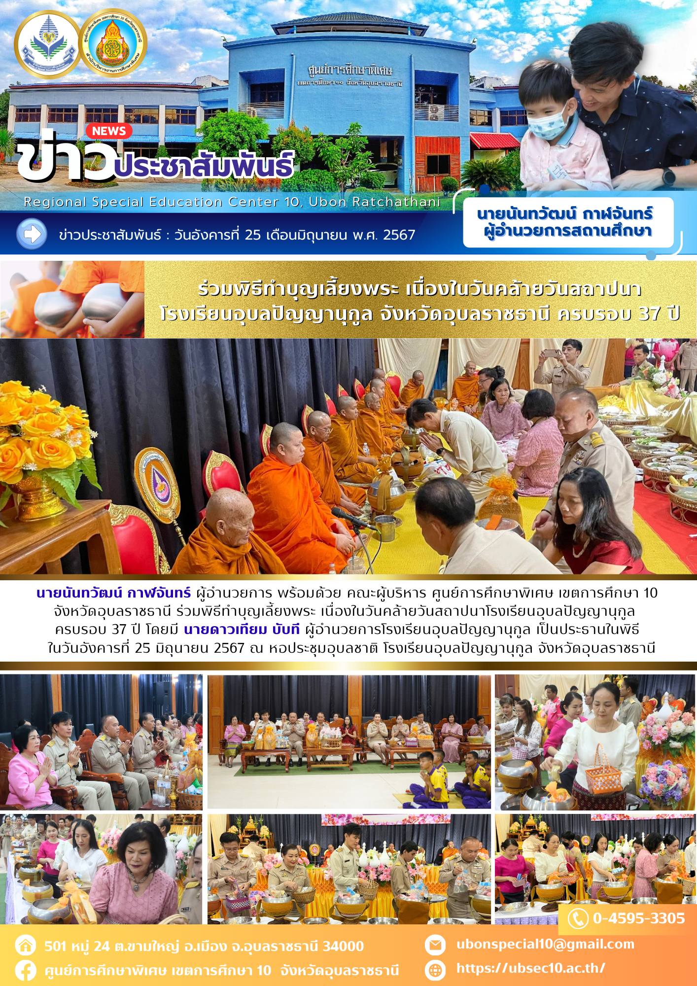 ร่วมพิธีทำบุญเลี้ยงพระ เนื่องในวันคล้ายวันสถาปนาโรงเรียนอุบลปัญญานุกูล ครบรอบ 37 ปีBy ชนินทร์ ศรีส่อง / 25 มิถุนายน 2024