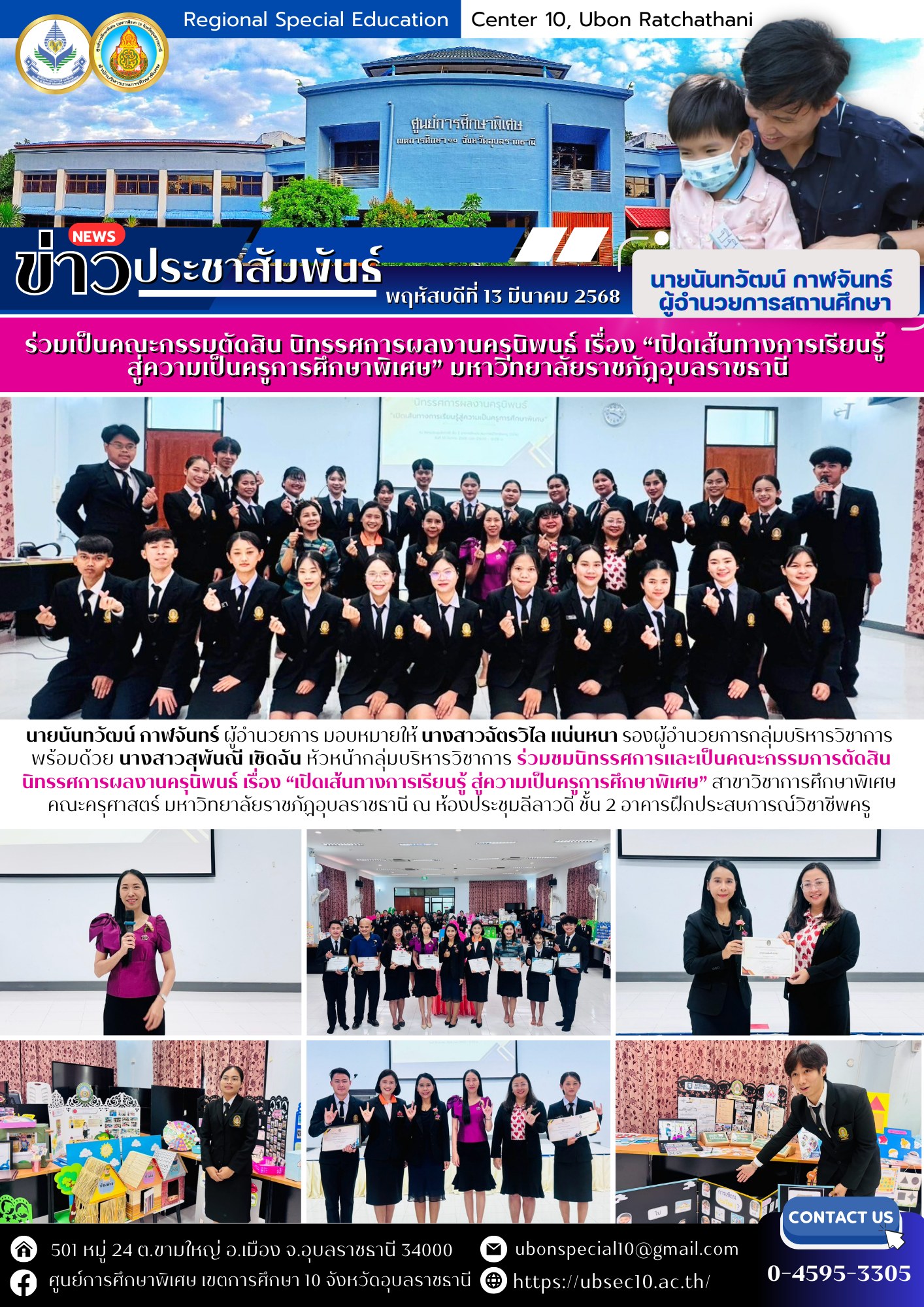 ร่วมชมนิทรรศการและเป็นคณะกรรมการตัดสินนิทรรศการผลงานครุนิพนธ์ เรื่อง “เปิดเส้นทางการเรียนรู้ สู่ความเป็นครูการศึกษาพิเศษ” สาขาวิชาการศึกษาพิเศษ คณะครุศาสตร์ มหาวิทยาลัยราชภัฏอุบลราชธานีBy ชนินทร์ ศรีส่อง / 13 มีนาคม 2025
