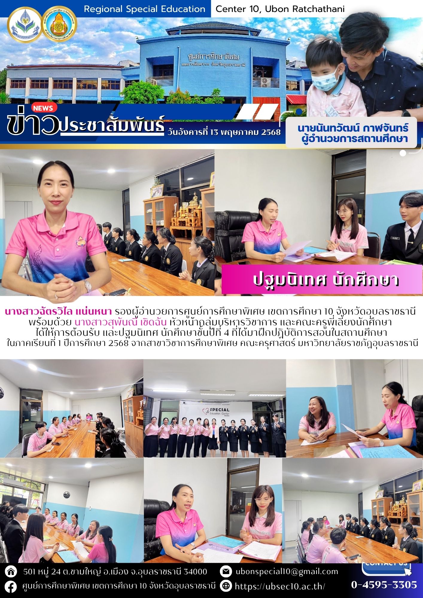 ปฐมนิเทศ นักศึกษาชั้นปีที่ 4 ที่ได้มาฝึกปฏิบัติการสอนในสถานศึกษาในภาคเรียนที่ 1 ปีการศึกษา 2568 จากสาขาวิชาการศึกษาพิเศษ คณะครุศาสตร์ มหาวิทยาลัยราชภัฏอุบลราชธานีBy ชนินทร์ ศรีส่อง / 13 พฤษภาคม 2025