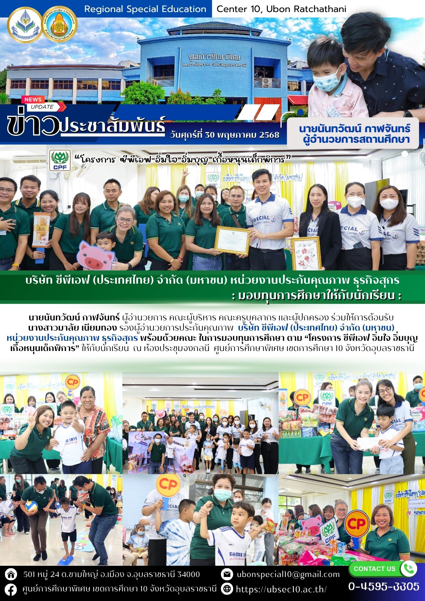 ให้การต้อนรับบริษัท ซีพีเอฟ (ประเทศไทย) จำกัด (มหาชน) หน่วยงานประกันคุณภาพ ธุรกิจสุกร พร้อมด้วยคณะ ในการมอบทุนการศึกษา ตาม “โครงการ ซีพีเอฟ อิ่มใจ อิ่มบุญ เกื้อหนุนเด็กพิการ” ให้กับนักเรียนBy ชนินทร์ ศรีส่อง / 30 พฤษภาคม 2025