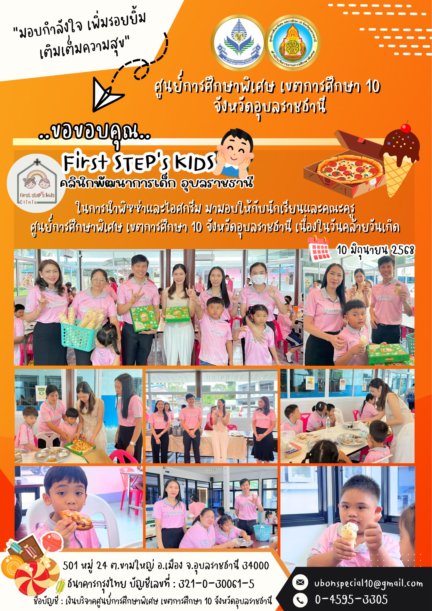 ขอขอบคุณ “คลินิกพัฒนาการเด็ก อุบลราชธานี (First STEP’s KIDS)” ที่ให้การสนับสนุนน้องๆคนพิเศษBy ชนินทร์ ศรีส่อง / 10 มิถุนายน 2025