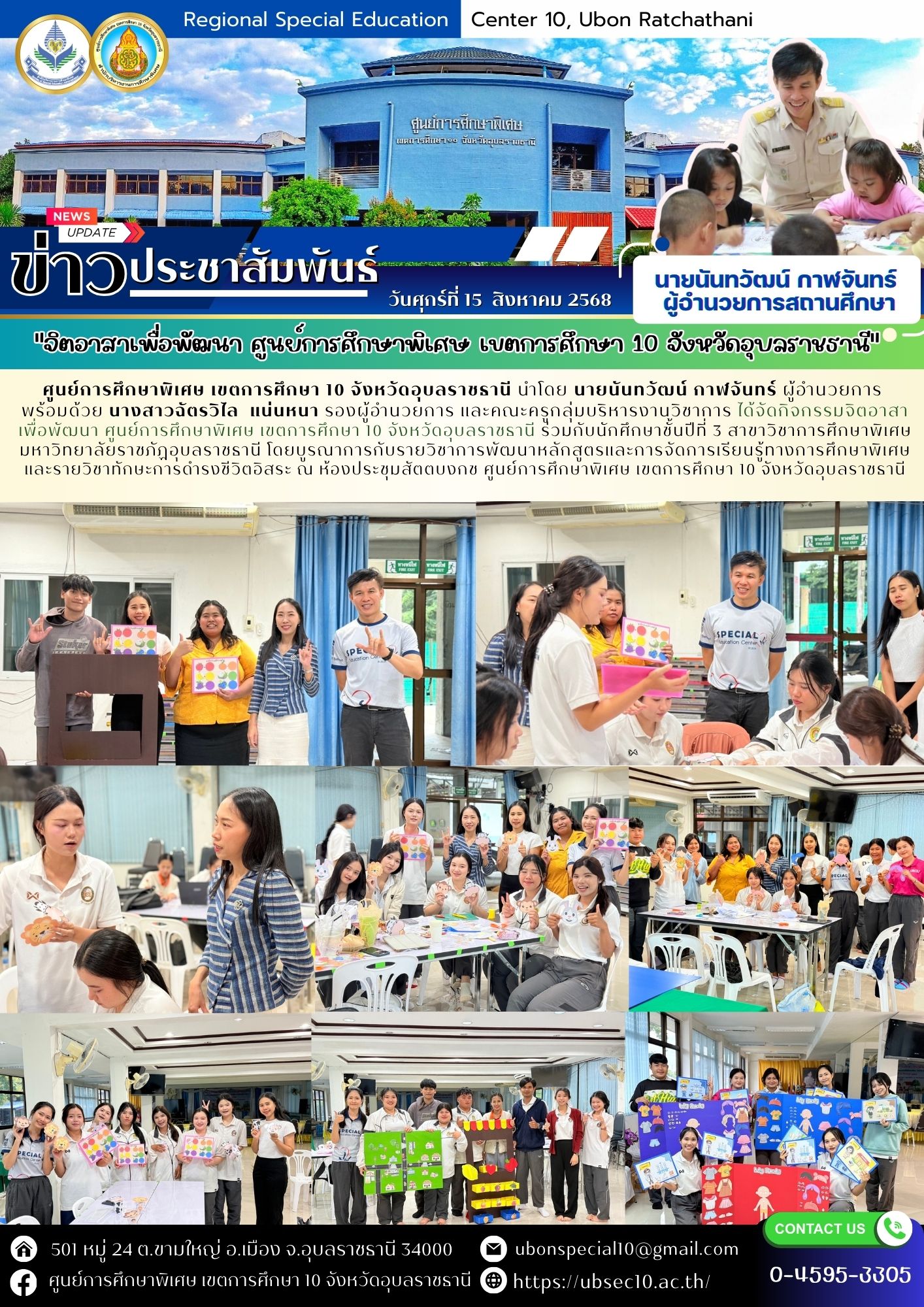 กิจกรรมจิตอาสาเพื่อพัฒนา ศูนย์การศึกษาพิเศษ เขตการศึกษา 10 จังหวัดอุบลราชธานี ร่วมกับนักศึกษาชั้นปีที่ 3 สาขาวิชาการศึกษาพิเศษ มหาวิทยาลัยราชภัฏอุบลราชธานีBy ชนินทร์ ศรีส่อง / 15 สิงหาคม 2025