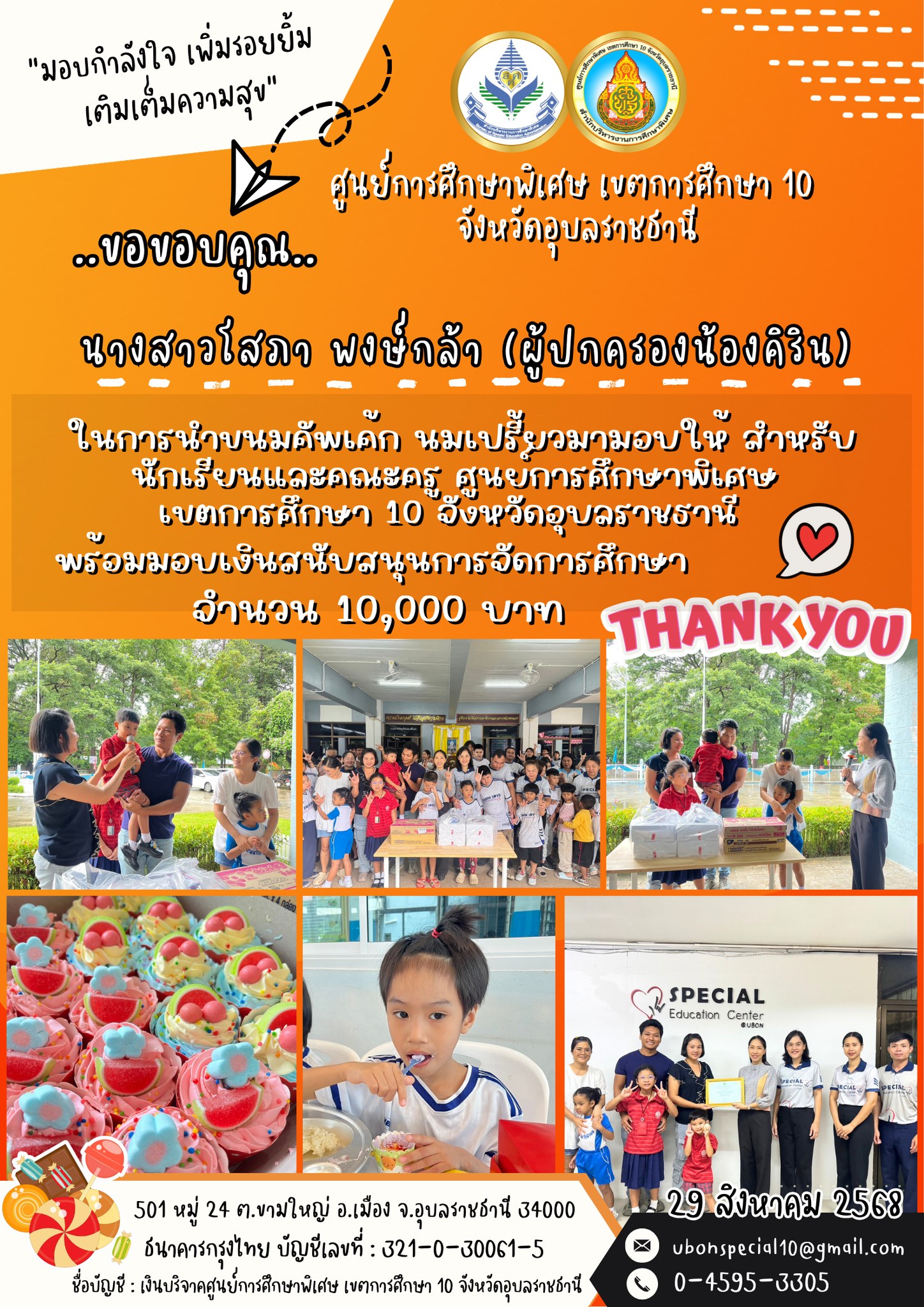 ขอขอบคุณนางสาวโสภา พงษ์กล้า (ผู้ปกครองน้องคิริน) ที่ให้การสนับสนุนน้องๆคนพิเศษBy ชนินทร์ ศรีส่อง / 29 สิงหาคม 2025