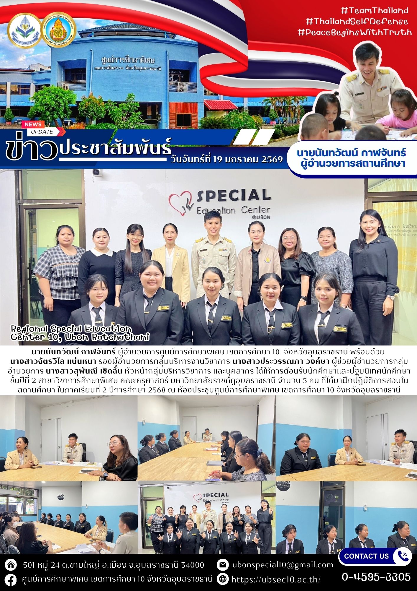 ให้การต้อนรับนักศึกษาและปฐมนิเทศนักศึกษาชั้นปีที่ 2 สาขาวิชาการศึกษาพิเศษ คณะครุศาสตร์ มหาวิทยาลัยราชภัฏอุบลราชธานี จำนวน 5 คน ที่ได้มาฝึกปฏิบัติการสอนในสถานศึกษา ในภาคเรียนที่ 2 ปีการศึกษา 2568By ชนินทร์ ศรีส่อง / 19 มกราคม 2026