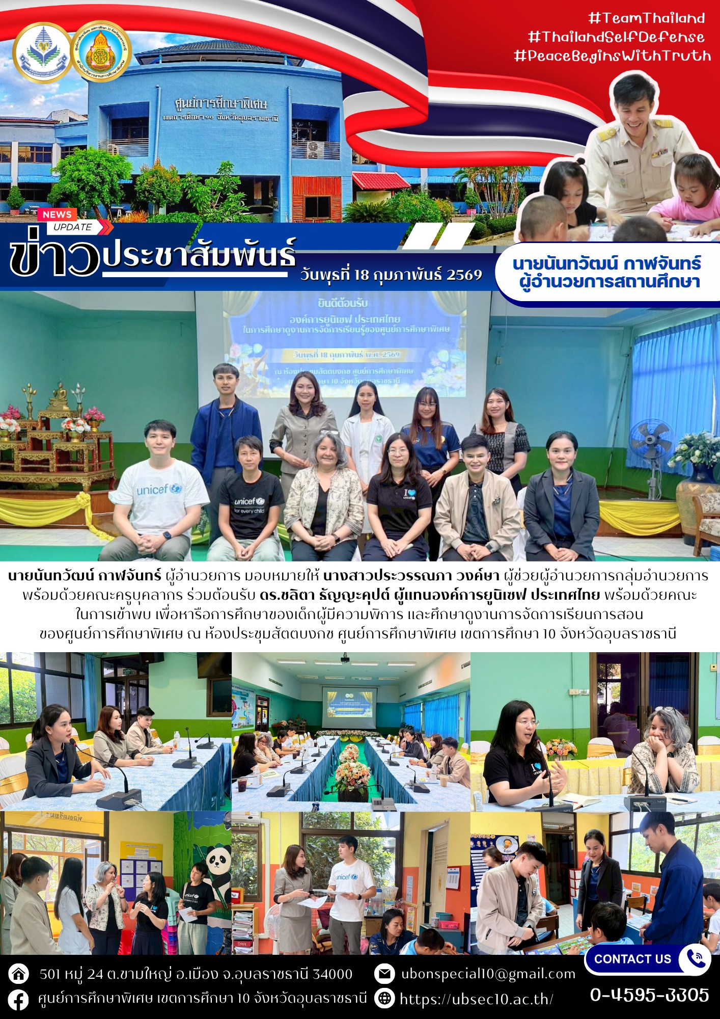 ต้อนรับ ดร.ชลิตา ธัญญะคุปต์ ผู้แทนองค์การยูนิเซฟ ประเทศไทย พร้อมด้วยคณะ ในการเข้าพบ เพื่อหารือการศึกษาของเด็กผู้มีความพิการ และศึกษาดูงานการจัดการเรียนการสอน ของศูนย์การศึกษาพิเศษBy ชนินทร์ ศรีส่อง / 18 กุมภาพันธ์ 2026