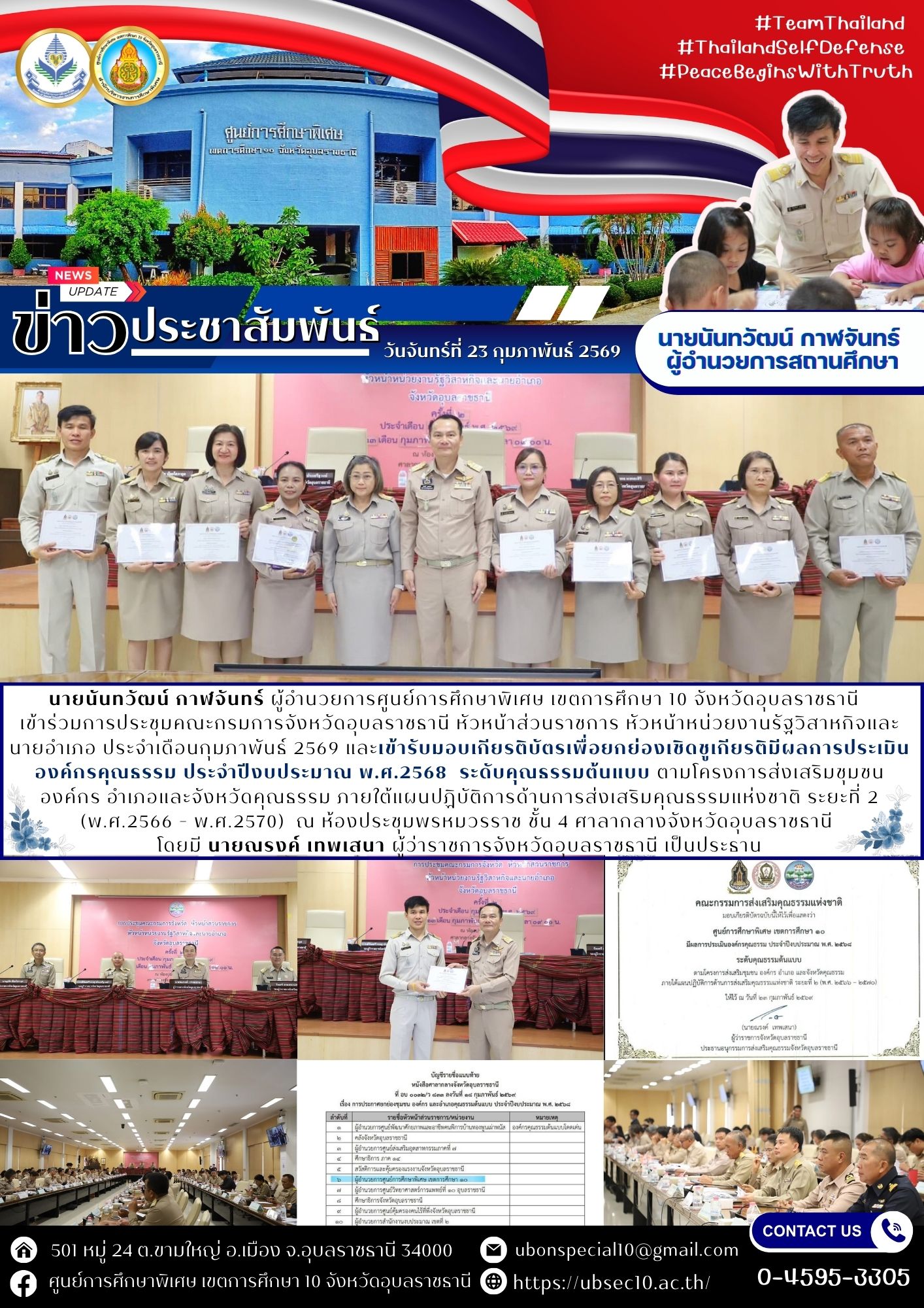รับมอบเกียรติบัตรเพื่อยกย่องเชิดชูเกียรติมีผลการประเมินองค์กรคุณธรรม ประจำปีงบประมาณ พ.ศ.2568 ระดับคุณธรรมต้นแบบ ตามโครงการส่งเสริมชุมชน องค์กร อำเภอและจังหวัดคุณธรรม ภายใต้แผนปฏิบัติการด้านการส่งเสริมคุณธรรมแห่งชาติ ระยะที่ 2 (พ.ศ.2566 – พ.ศ.2570)By ชนินทร์ ศรีส่อง / 23 กุมภาพันธ์ 2026