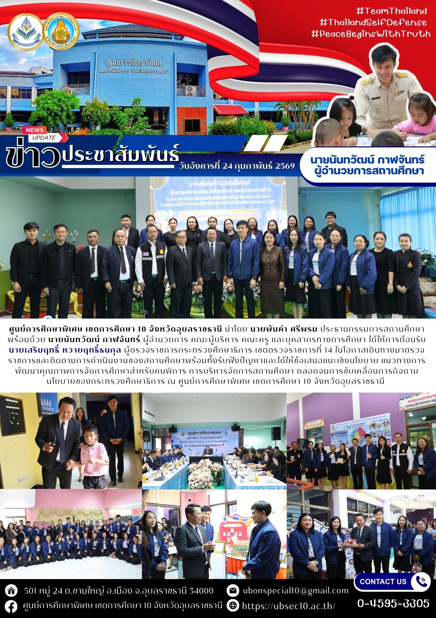 ต้อนรับ นายเสริมฤทธิ์ หวายฤทธิ์ธนกุล ผู้ตรวจราชการกระทรวงศึกษาธิการ เขตตรวจราชการที่ 14 ในโอกาสเดินทางมาตรวจราชการและติดตามการดำเนินงานของสถานศึกษาพร้อมทั้งรับฟังปัญหาและได้ให้ข้อเสนอแนะเชิงนโยบาย แนวทางการพัฒนาคุณภาพการจัดการศึกษาสำหรับคนพิการ การบริหารจัดการสถานศึกษา ตลอดจนการขับเคลื่อนภารกิจตามนโยบายของกระทรวงศึกษาธิการ